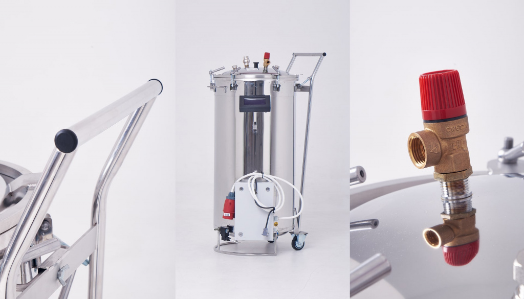 Электрический автоклав из нержавеющей стали с полностью автоматизированным процессом стерилизации. Оснащен электрическим блоком управления (ЭБУ) с возможностью стерилизации в 4 автоматических режимах "Мясо", "Птица", "Рыба", "Компот". В автоклаве предусмотрены автоматические режимы для жестяных банок и реторт-пакетов. Есть возможность сохранения до 10 собственных программ стерилизации для каждого вида упаковки.